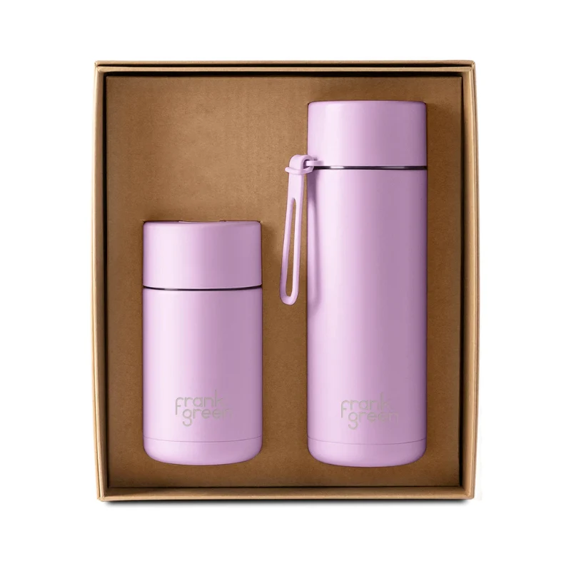 The Ultimate Ceramic gift set from Frank Green. The updated gift set contains a 12oz Reusable Cup (with push top lid) & 20oz Reusable Bottle (with straw lid).