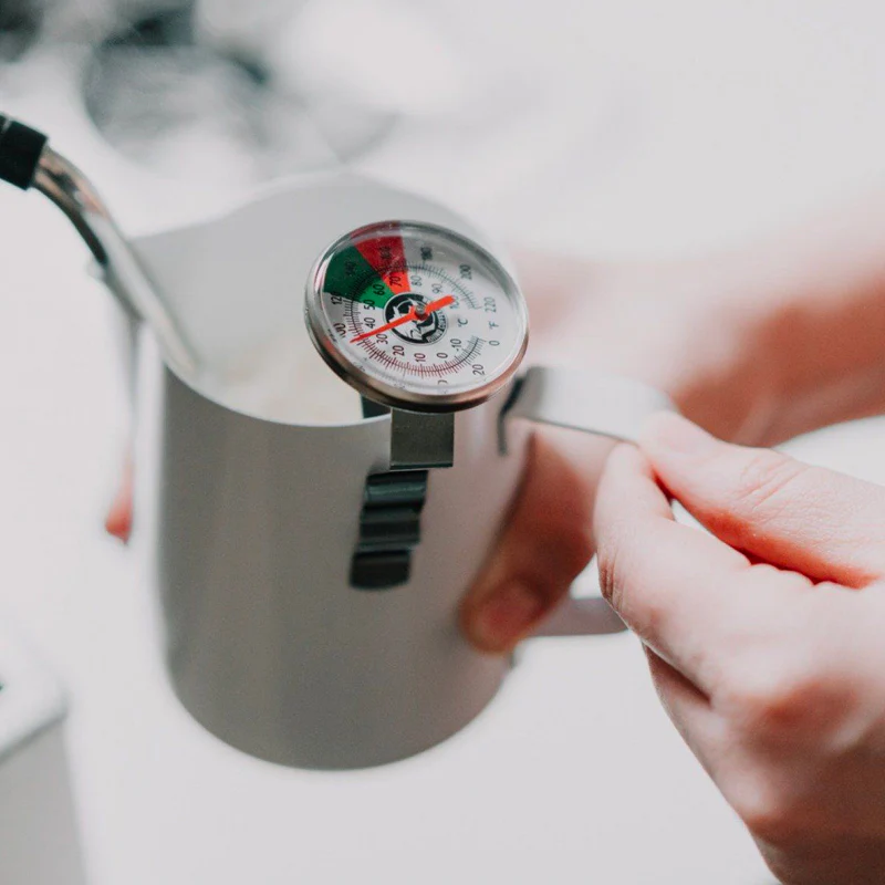 The easy to read dial on the Rhino Coffee Gear Milk Thermometer allows for quick and accurate measure of textured milk and other beverages.